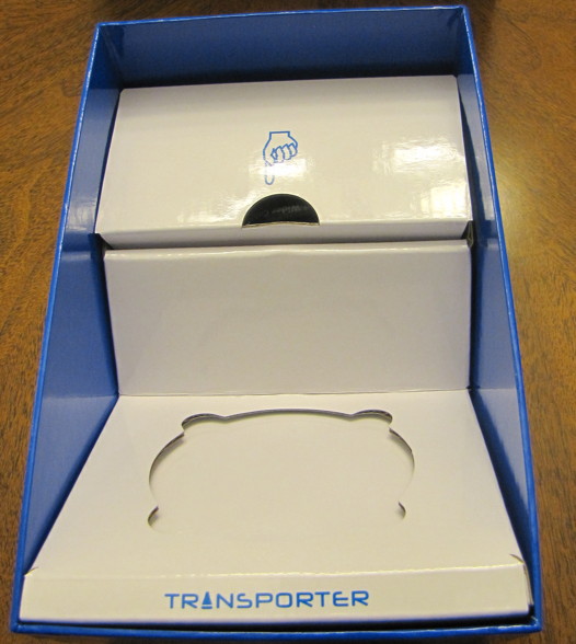 After slicing through the stickers, the top of the box lifts off. The transporter sits at an angle in the box, which is why the box is so much bigger than it seems it should be.