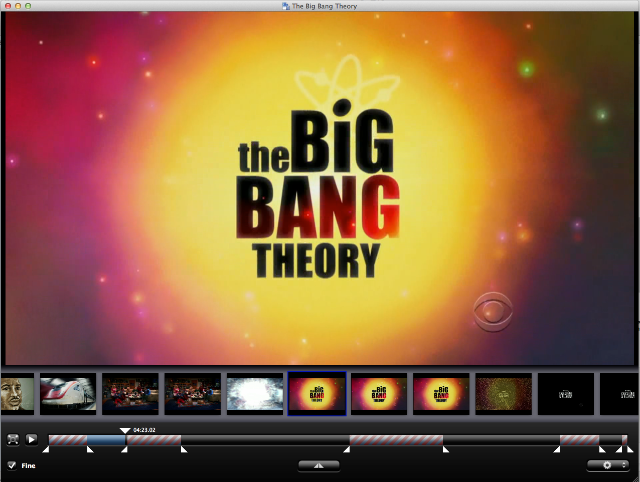 The built-in editing software allows you to mark the beginning and end of the commercials. You can quickly scrub through thumbnails of the show. When you get to a commercial, you click the mark button. That creates two handles, one for the beginning of the mark, one for the end. Drag the end handle until the show is ready you start, and then drag the show scrub until the next commercial. Repeat until you get to the end, and you end up with something that looks like this: