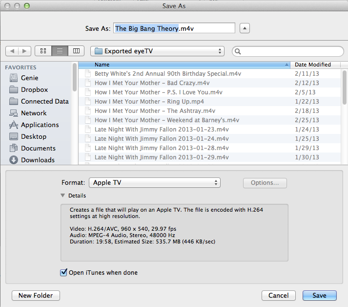 The export dialog even has a button to automatically open it in iTunes. The meta data from the program guide gets added to iTunes and then it pops up on my AppleTV ready to watch. The whole thing takes about half an hour to mark and export the show, so it does require a little more of a delay before you can watch it, but it’s not too bad in most cases.