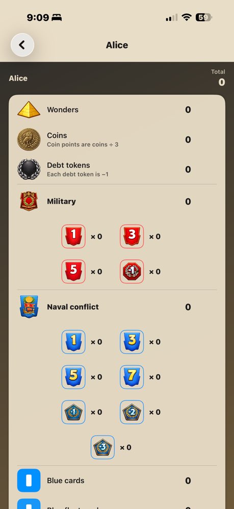 Full scoring for 7 Wonders — military tokens, coin tracking, science calculations, and all expansion support.